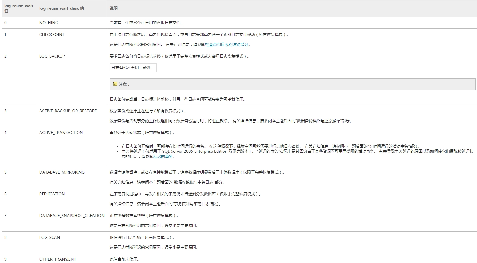 下表为log_reuse_wait 和 log_reuse_wait_desc 的值的解释
