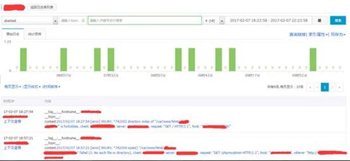 这里是借助于日志服务中的日志索引功能,通过控制台来查询日志,我一般是用这个来跟踪一些用户的访问行为,这里查询速度是非常快的,基本上都是一秒钟内出结果。
