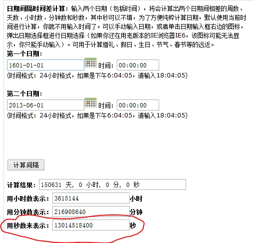 首先我们要计算从从1601年1月1号0时到2013年6月1日0时所经过的秒数。这个我们通过工具来计算